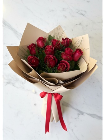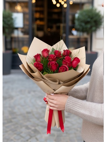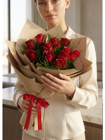 10 adet kırmızı güller ve yeşillikler ile soft renkli süslemeler ile şık bir buket hazırladık.