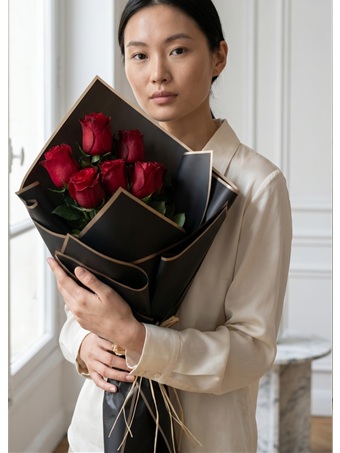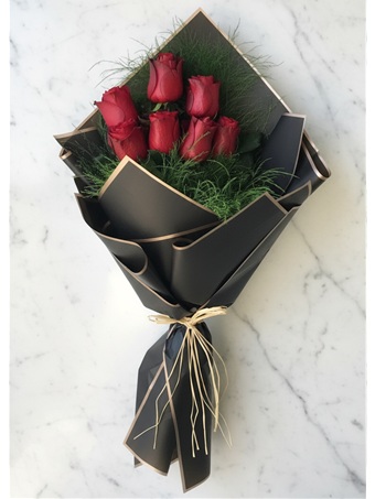 7 Gül ve Mevsim yeşillikleri kullanılarak Siyah ve Kırmızının mükemmel uyumunun yakalndığı bir buket tasarımı oluşturduk.