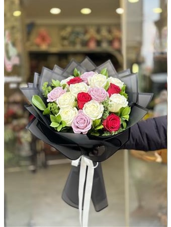 Buket içinde toplam 17 adet gül ile Kırmızı, lila ve beyazın ahenkli uyumu bir bukette sizlerle..