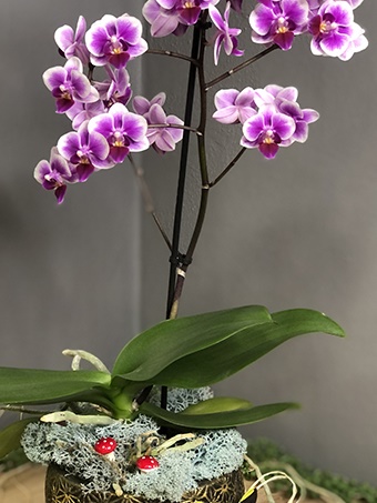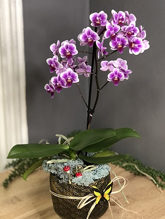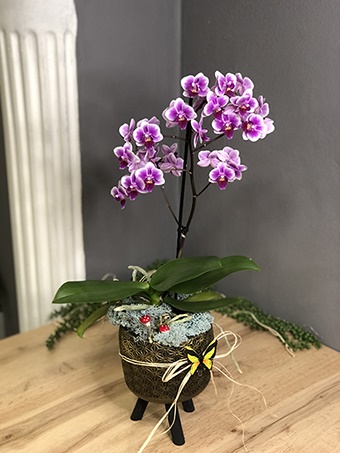 3 Ayaklı saksı içerisinde desenlerini ve şekillerini her sezon bulamayacağımız orta boylarda mor orkide kullanılmıştır. Çiçek bakımından oldukça zengin olan bu orkideden sınırlı sayıda ve belirli tarih aralığında bulunmaktadır. Dekoratif İsveç yosunları ve mantarlar kullanılarak hazırlanmıştır.