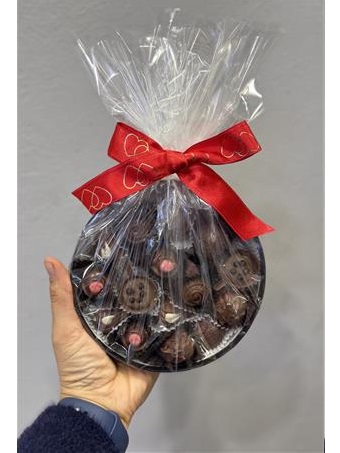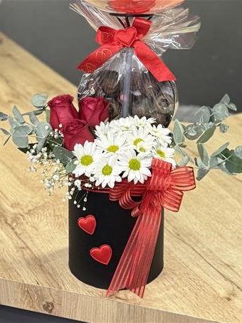 Siyah kutu içinde üç adet canlı Kırmızıgül, papatyalar ile 15 adet özel dolgulu çikolatalar ve kalpli balonlar ile Özel bir tasarım oluşturduk.