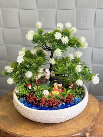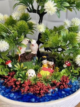 Seramik saksı da yapay göl yapay ağaç ve sevimli çift biblosu. Figürlerde modeller değişiklik gösterebilir.