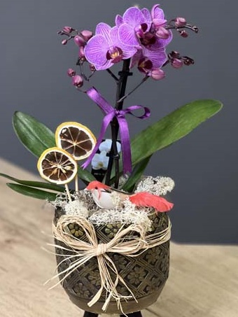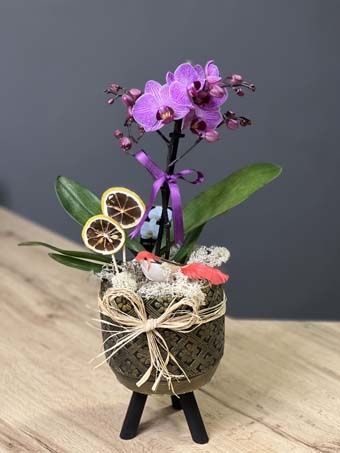 Üç ayaklı saksıda mini orkide, dekoratif portakal kabukları ve yosunlar ile hazırlanmıştır.