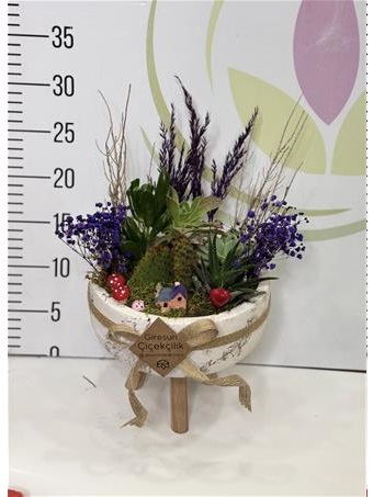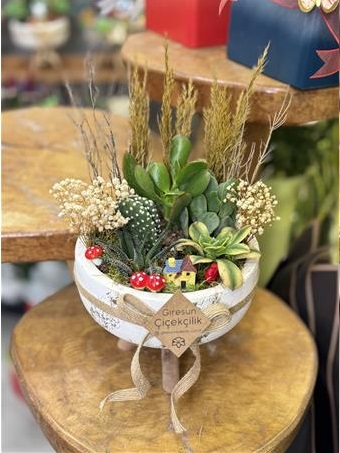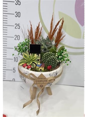 Kaktüsler ve Sukulentler kullanılmıştır. 17cm çapında beton saksı içerisinde ithal yosunlar, mantarlar ve taşlar ile hazırlanmıştır. Ürünün yerden yüksekliği 17cm olup bitkiler ile 18-20cm arasında değişmektedir..