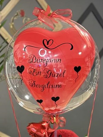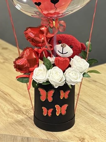 Siyah silindir kutu içinde bir adet 20cm Peluş ayıcık, yapay beyaz güller, mini metalik balon ve bir adet kalp çikolata ile özel tasarım oluşturduk.