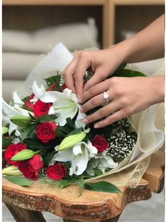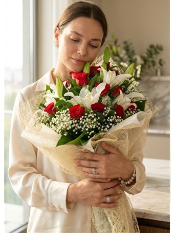 Kırmızı güller ve beyaz kokulu lilyumların bir araya gelmesiyle şık ve zarif bir buket hazırlanmıştır.