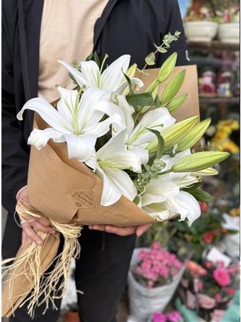 Kokulu Beyaz Zambaklar kraft kağıt ile zarif bir şekilde hazırlanmıştır.