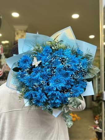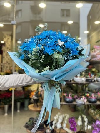 Mavi boyalı kasımpatı, cipsofilya ve okaliptuslar ile hazırlanmıştır.