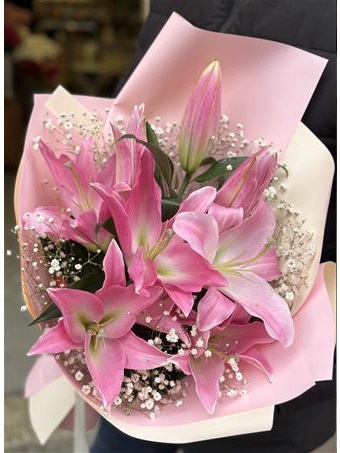 3 dal pembe kokulu zambak/lilyum ve cipsofilyalar kullanılarak hazırlanmıştır.