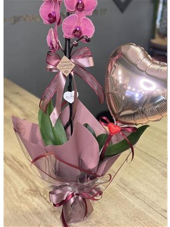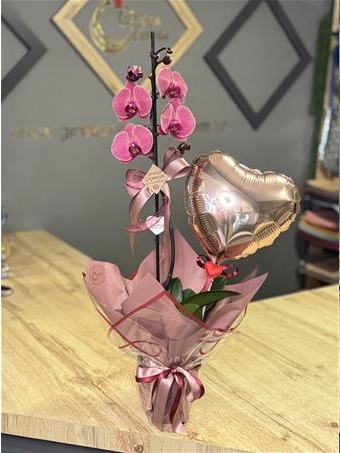 Gül kurusu pembe tonlarında tek dallı orkide ve rose gold metalik balon, uyumlu tonlarda süsleme yapılmıştır.  Işık ve fotoğraf çekimine göre renk tonlarında değişiklik görülebilir.