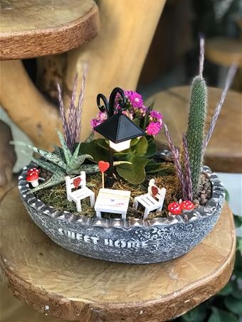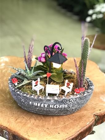 Özel tasarım seramik saksı da özenle seçilmiş kaktüs & sukulent ve çeşitli aksesuarlar ile dekore edilmiştir.