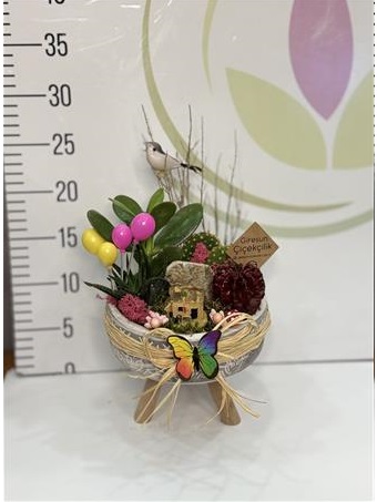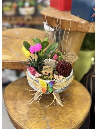 Üç ayaklı beton saksı içerisinde skulentler kaktüsler ve taş ev biblosu kullanılarak hazırlanmıştır.