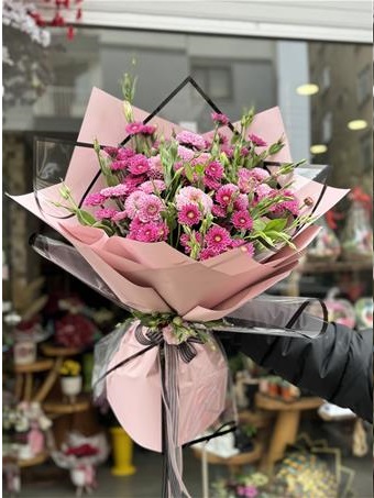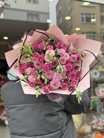 Kasımpatının iki renk tonu ve çeşitli yeşillikler kullanılarak hazırlanmıştır.
