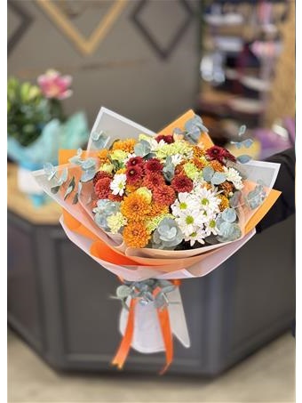 Mevsimin en güzel çiçeklerini kullanarak Turuncu detaylı dış süsleme ile hazırlanmıştır.