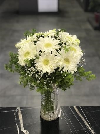Cam Vazo içerisinde Beyaz celberalar ve Cipsolar ile hazırlanmıştır.